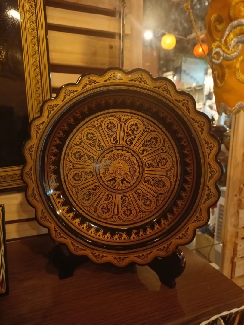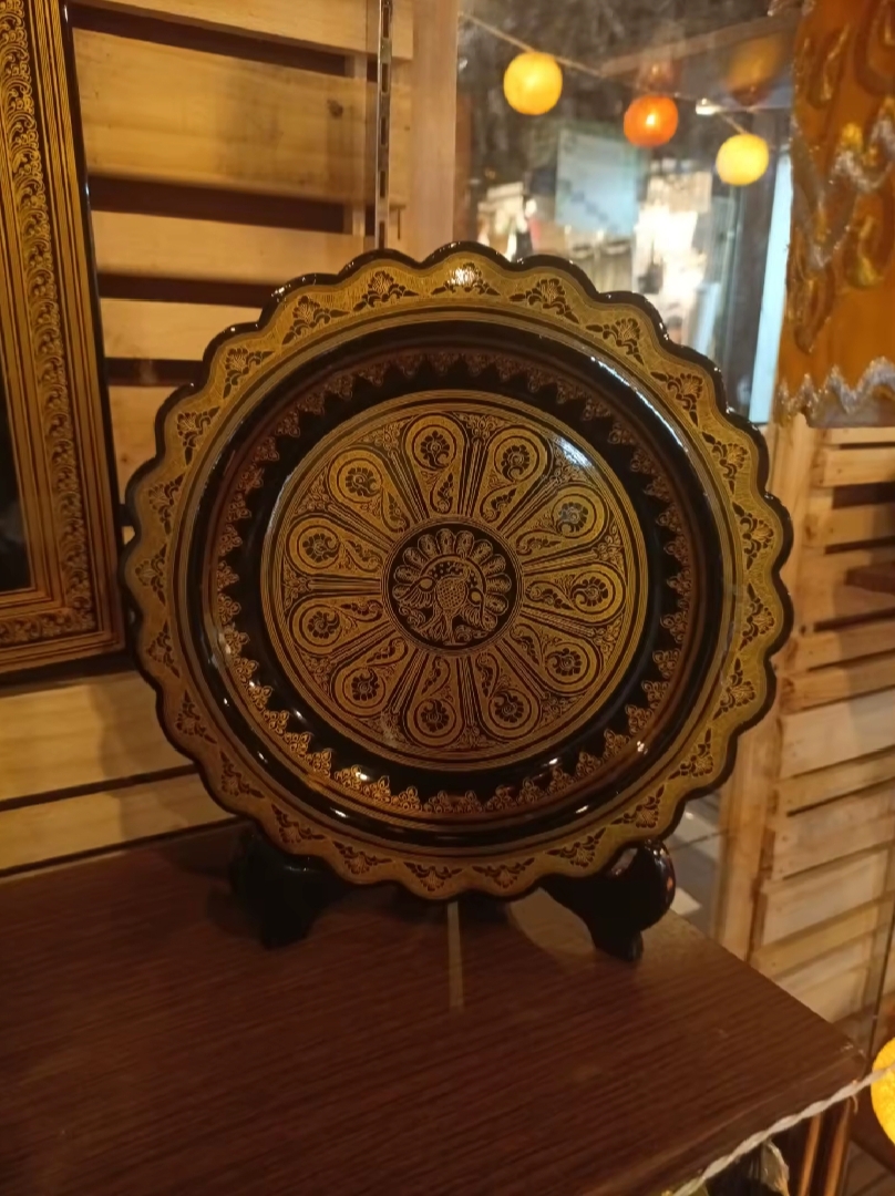 ยกระดับพื้นที่ของคุณด้วยเสน่ห์อันเจิดจรัสของจานเคลือบสีทองพม่าใบนี้ นับเป็นตัวอย่างอันวิจิตรของศิลปะพม่าแบบดั้งเดิม จานแต่ละใบผลิตด้วยมือโดยใช้เทคนิคเครื่องเคลือบโบราณที่สืบทอดกันมาหลายชั่วอายุคน เคลือบด้วยยางไม้ธรรมชาติอย่างพิถีพิถัน ตกแต่งด้วยลวดลายสีทองและภาพสลักนูนต่ำอันวิจิตรบรรจง ถ่ายทอดภาพสัตว์ในตำนาน ลวดลายดอกไม้ หรือฉากต่างๆ จากนิทานทางพุทธศาสนา